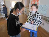 縄跳びの中間記録会を行うにあたり、2年生の計測を5年生が行いました。