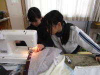 エプロンづくりもそろそろ仕上げへ。丁寧に縫い進めています。