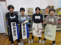 エプロンづくりもそろそろ仕上げへ。丁寧に縫い進めています。