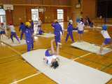 体育では、開脚後転の練習を行いました。マットを重ねたり、ロイター版を使って坂道...