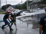 放水体験では実際の防火服に着替えて、放水を行いました。 放水の勢いや防火服の重さ...