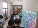1学期に全校が書いた「ありがとうの花」が飾られた「ありがとうの並木道」を学級で見...