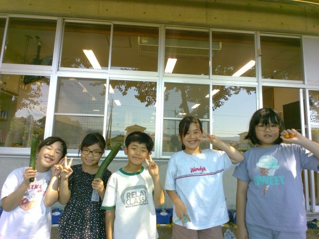 がんばって育てている野菜が、収穫できています。嬉しそうな子供たちです。