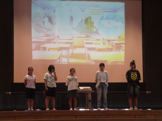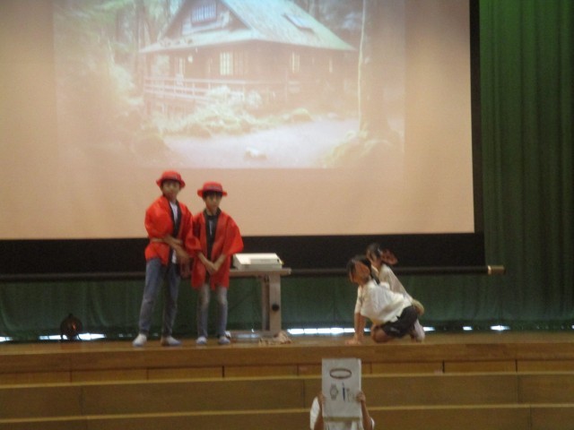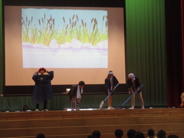 宮沢賢治の生涯や、記した物語を劇にして表現しました。小道具やスライドを活用して、一年生から楽しめるように工夫しました。