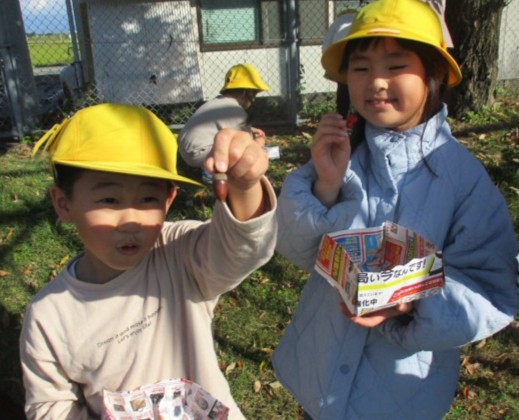 よい天気の中、外に出て秋見つけをしました。赤い葉っぱやどんぐりを見つけ、どんな遊びに使おうかと考える子供たちでした。