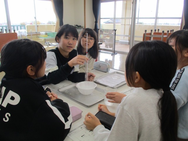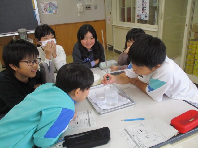 班の友達と実験準備や片付けまで、協力して取り組んでいます。