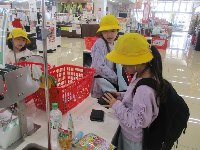 最後に、買い物をしました。事前に決めていたものを探し、しっかりと支払いをすることができました。また、買い物をしながら、商品の並べ方の工夫、商品を見付けやすくする工夫等を見付けていました。
