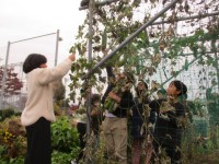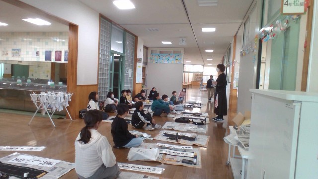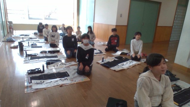 1月の書初大会に向け、新聞紙を広げて床で書く練習を始めました。