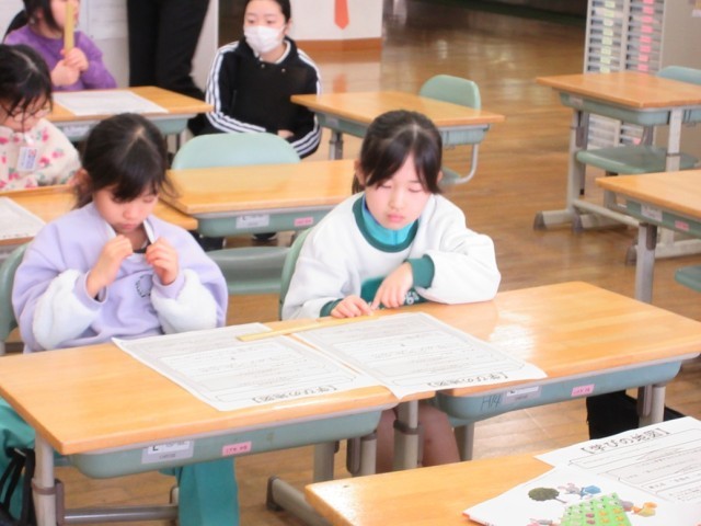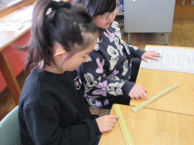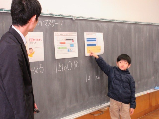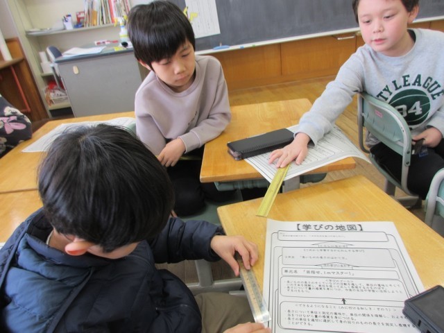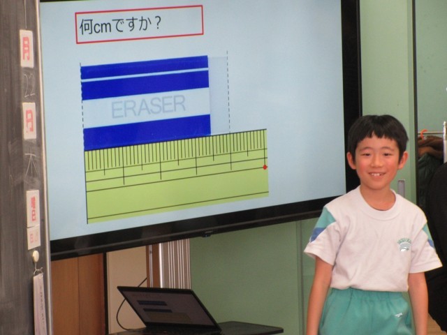 これまでの学習を振り返った後、30cmものさしを使って机の横の長さを測定しました。