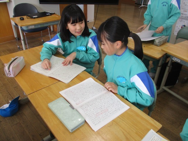 国語で、たから島の探検をするお話づくりの学習をしています。それぞれの物語が仕上がり、友達と読み合いました。友達のまねしたい表現やおもしろい話の展開を見付け、相手に伝えていました。