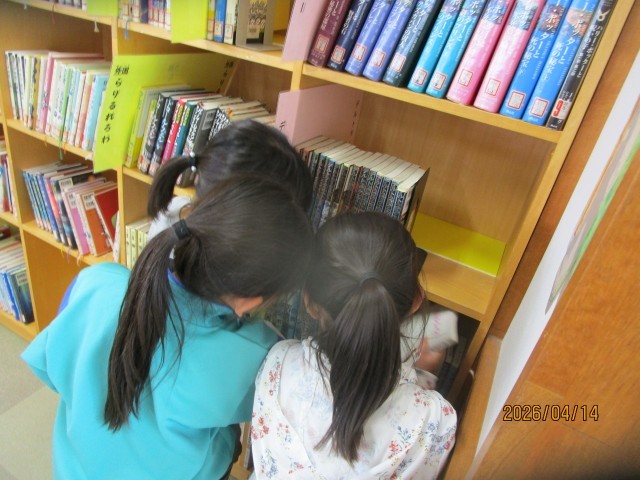 司書の先生から、図書館の利用についてのお話を聞きました。「本の住所」について教えていただき、本についているラベルを見ながら、読んでみたい本を探すことができました。