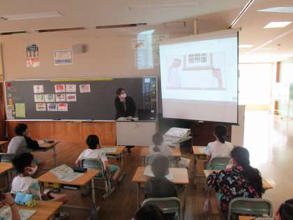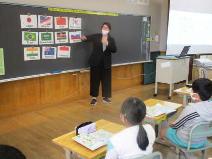 大きなジェスチャーとよく通るきれいな声が魅力的で、子供たちは楽しそうに学習していました。今日は、いろいろな国の挨拶を知り、友達とやり取りをしました。