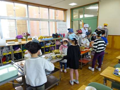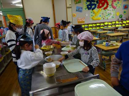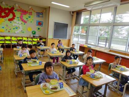 今日から初めての給食がスタートしました。小学校での給食が初めての子供たち。わくわくしながら給食の準備を進めていました。給食を食べると「おいしい〜!」と、にっこり笑顔。来週からの給食がさらに楽しみになったようです。