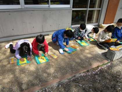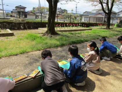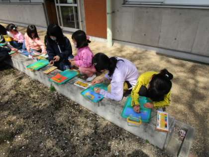 チューリップやタンポポ、桜の木などが2年松組から見えます。今日はテラスに出て、おはなみスケッチをしました。花びらや葉の形をよく観察して、クレヨンで描きました。「たくさん描きたい!」と画用紙を取りに来るなど、友達と楽しみながら、描くことができました。