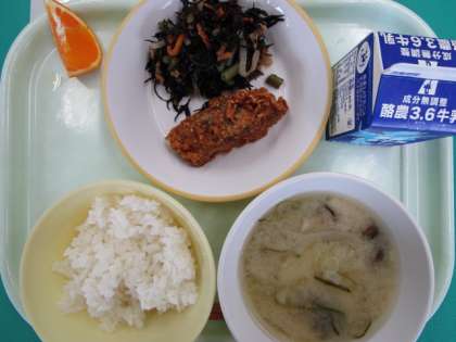 今日の給食の献立は、ご飯、牛乳、魚の利休揚げ、ひじきの炒め煮、みそ汁、清見オレンジ です。