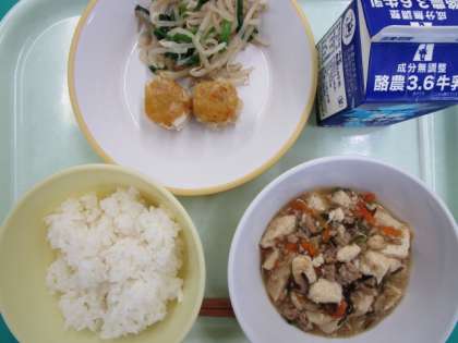 今日の給食の献立は、ご飯、牛乳、にんじんシューマイ、塩ナムル、マーボー豆腐 です。