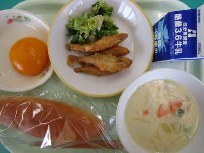 今日の給食の献立は、米粉コッペパン、牛乳、わかさぎのフリッター、グリーンサラダ、クリーム煮、もも缶 です。