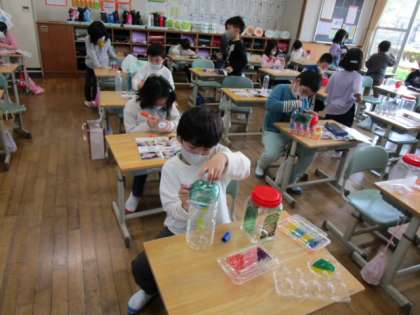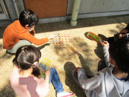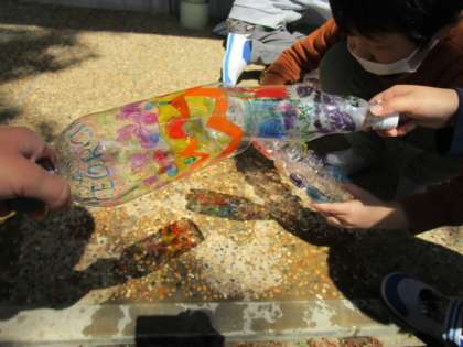 家から持ってきたペットボトルや卵のパックを使って、ひかりのプレゼントを作りました。透明な容器に色をつけると、色鮮やかな容器に変身!さらに日光を当てると、地面には様々な色が重なって、きれいに映し出されました。