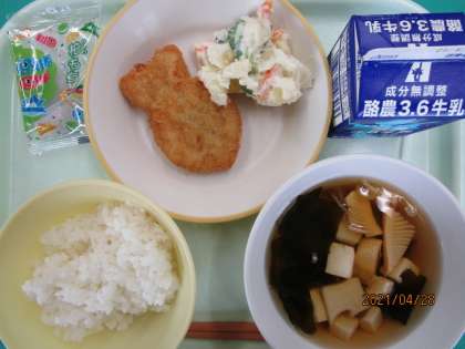 今日の給食の献立は、ご飯、牛乳、おさかなカツ、ポテトサラダ、若竹汁、かしわもち です。