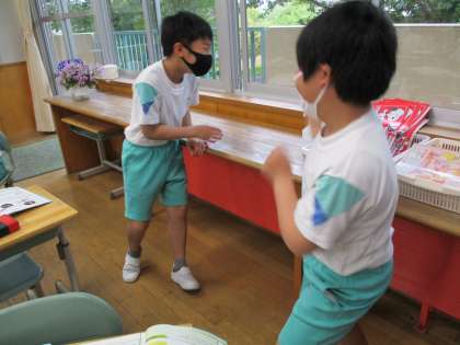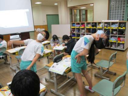 理科の学習では、からだの仕組みについて調べています。今日は体中の関節を探すべく、自分の体を曲げ伸ばししながら活動しました。