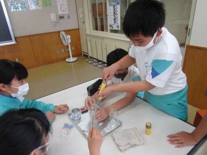 上の写真は、理科「物の燃え方と空気」の学習、真ん中の写真は、体育科「リレー」の学習、下の写真は、家庭科「見つめてみよう生活時間」の学習の様子です。