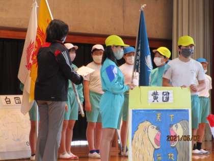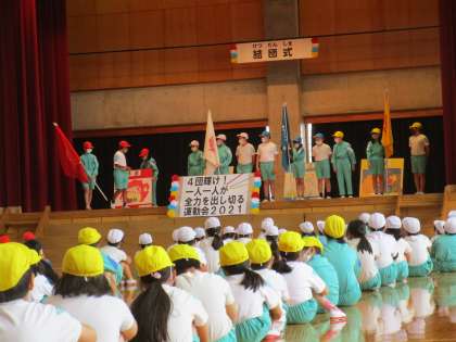今日は令和3年度運動会に向けて、結団式を行いました。まずは、団役員の自己紹介です。次に、スローガン「4団輝け 一人一人が全力を出し切る 運動会 2021」を発表し、込めた思いを説明しました。その後、各団長が校長先生から団旗を受け取り、意気込み等を語りました。