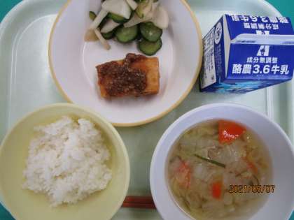今日の献立は、ご飯、牛乳、揚げ出し豆腐のごまだれかけ、かぶのレモン和え、つみれ汁 です。