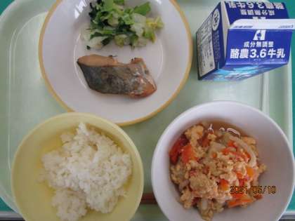 今日の給食の献立は、ご飯、牛乳、サワラの西京焼き、おひたし、親子煮 です。