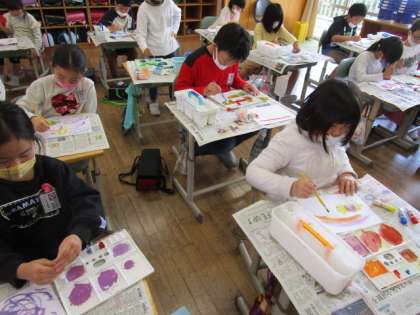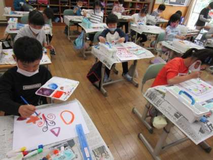 前回の図画工作科では、絵の具、水、筆を使って水彩道具の正しい使い方を学習し、今日は自分の「いい感じ」を画用紙いっぱいに表現しました。水を減らしたかすれた感じが好きな子供。水が多めの淡い色が好きな子供。いろいろな形が好きな子供。いろいろな線が好きな子供。