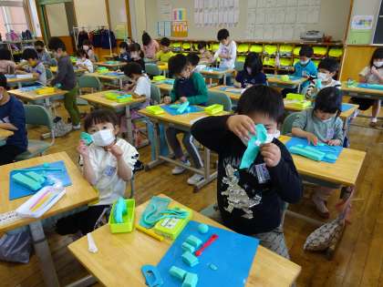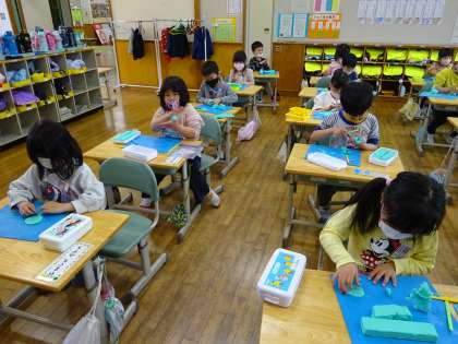 図画工作科では、初めてねん土を使って学習しました。こねる、丸める、ちぎる、のばすなど、色々な方法を試す子供たちの様子が見られました。作っているうちに、「たてる方法もあるよ!」「重ねるのもいいよ!」などと、ねん土となかよしになろうと意欲的に活動していました。