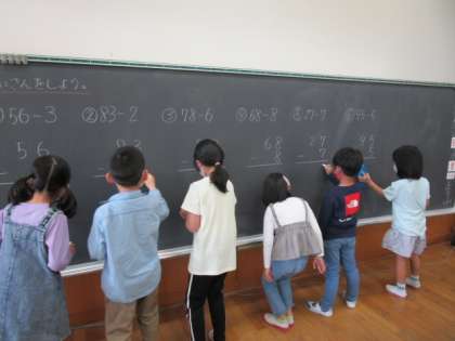 算数科では、引き算の筆算の学習をしています。正しく計算できるように、順序を確かめながら計算しています。