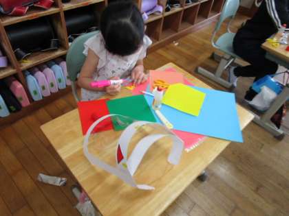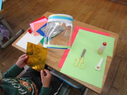 図画工作科では、「わっかでへんしん」の学習を行いました。フェイスシールドを基にして変身できるように飾り付けをしました。完成が楽しみです。
