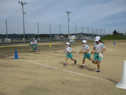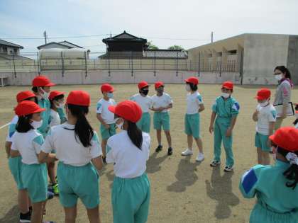 運動会へ向けて、団体競技「台風の目」の練習を行いました。今日は、ルールを確認し走順を決めました。「どうすればきれいに速くコーンを回ることができるか」「どうすれば安全に素早く棒を飛び越えることができるのか」考え、話し合いながら練習を進めていました。