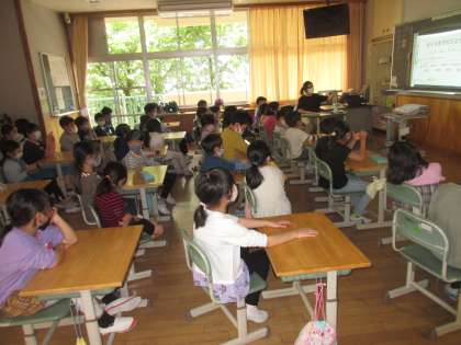 3年生は、一人一人がカイコを一頭ずつ飼育します。総合の時間に、みんなでお世話の仕方を学習し、孵化したばかりのカイコを観察しました。