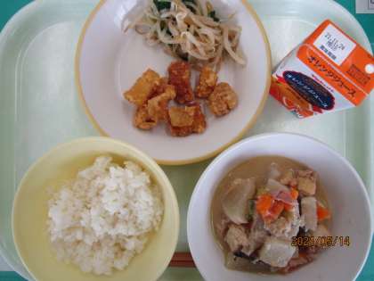 今日の給食の献立は、ご飯、オレンジジュース、イカのかりん揚げ、もやしのおひたし、豚肉と大根のごま味噌煮 です。