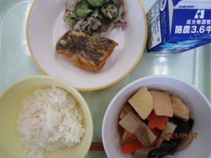 今日の給食の献立は、ご飯、牛乳、魚のスタミナ揚げ、ゆかり和え、炊き合わせ です。