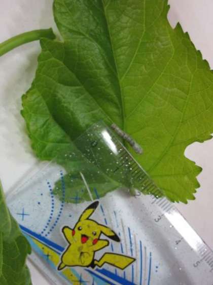 カイコが孵化して1週間が経ちました。体長が1cm程になったので、一人一人にカイコを渡し、お世話をスタートさせました。間近にカイコを見て「かわいい」と声をあげる子供たちが多くいました。名前をつけたり、ものさしで体長をはかったり、カイコへの気持ちが少しずつ高まっているようでした。