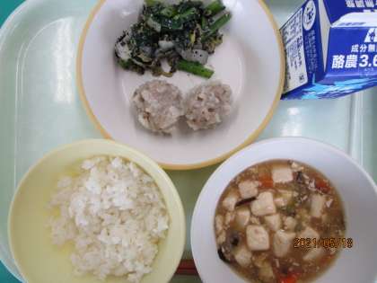 今日の給食の献立は、ご飯、牛乳、チンズワンズ、よごし、えびと豆腐のうま煮 です。