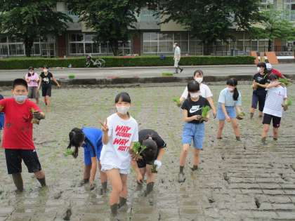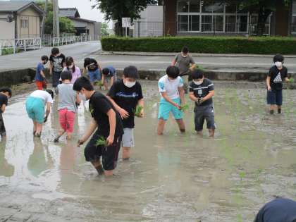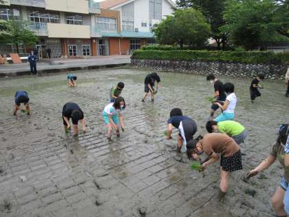 子供たちは、裸足で学校田に入って、手で苗を植えました。次第に上達していく子供たちでした。秋の収穫が楽しみです。