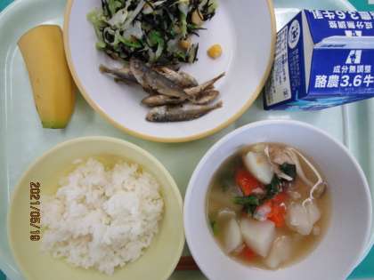 今日の献立は、ご飯、牛乳、小あじのから揚げ、ひじきのマリネ、ポトフ、バナナ です。