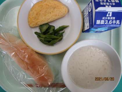 今日の給食の献立は、米粉コッペパン、牛乳、オムレツ、グリーンサラダ、ビーンズポタージュ です。