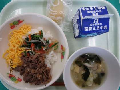 今日の給食の献立は、ご飯、牛乳、ビビンバ(焼き肉、ナムル、錦糸卵)、みそ汁、冷凍ラフランス です。
