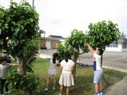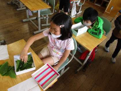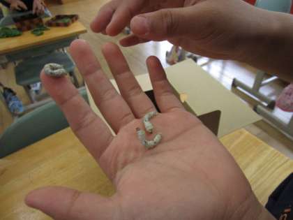 日増しに大きくなるカイコのために、せっせと桑の葉を取りに行き、観察することを楽しんでいる子供たち。カイコがかわいくて仕方のない子供は、飼育箱を開ける度に手に乗せて、愛おしそうに見つめたりなでたりしています。