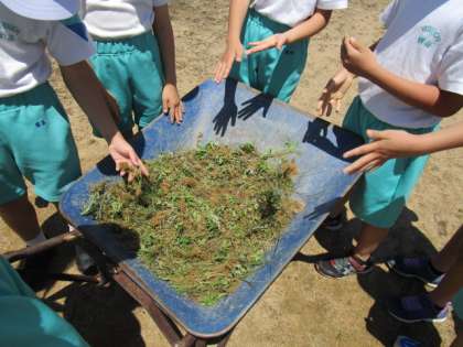 体育の時間に、80m走の練習とグラウンドの草むしりに取り組みました。来年度は、上学年の仲間入りです。学校のみんなのために働くことの大切さや、そのやりがいを感じられる3年生でありたいと思います。