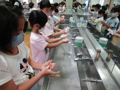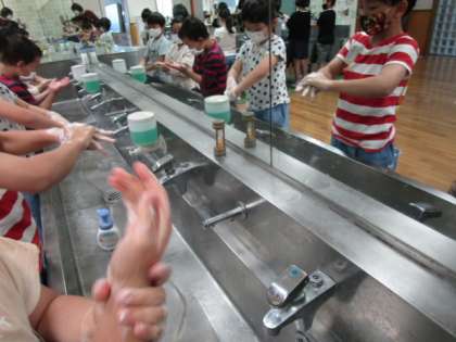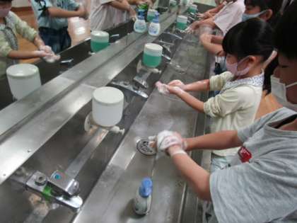 毎日している手洗いをもっとパワーアップしようと、手洗いの仕方について動画を見ながら確認しました。その後実際に石けんをつけて洗いました。洗い残しが多い部分を忘れずに、丁寧に洗いました。
