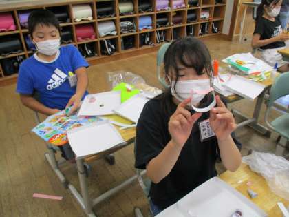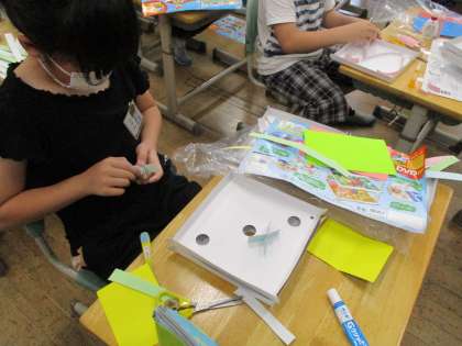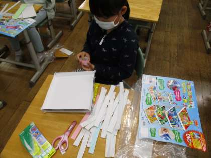 図工では、ビー玉を転がして遊ぶ迷路「コロコロガーレ」の製作を始めました。トンネルやアーチ、ジグザグ通路など、画用紙や段ボールの付け方を工夫して楽しんでいます。のびのびと作っていきましょう。