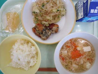 今日の給食の献立は、ご飯、牛乳、ちくわの南部揚げ、はるさめサラダ、かき玉汁、冷凍リンゴ です。
