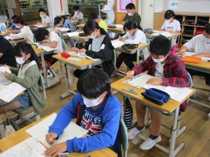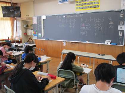 今日の算数科の学習では、「分数÷分数」の計算の仕方について考えました。6年生の子供たちは、できるようになろうと集中して学習に取り組んでいます。