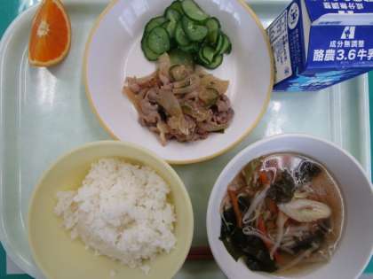 今日の給食の献立は、ご飯、牛乳、豚肉のしょうが焼き、きゅうりもみ、ワカメスープ、バレンシアオレンジ です。