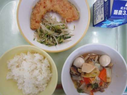 今日の給食の献立は、ご飯、牛乳、八宝菜、かぼちゃの天ぷら、甘酢和え でした。